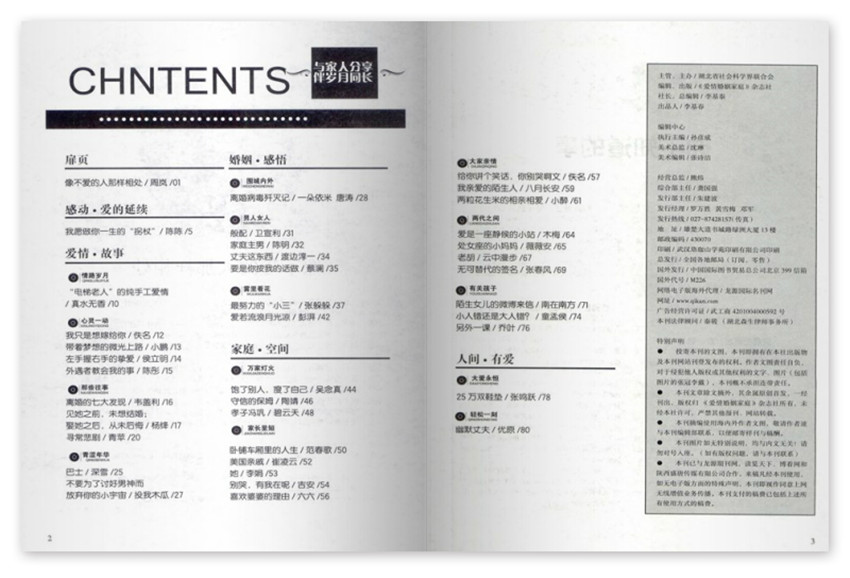《愛情婚姻家庭》雜志由當初的一報一刊發展到現在的《愛情婚姻家庭》雜志旬刊——上旬刊《生活紀實》;中旬刊《冷暖人生》,2008年10月冷暖人生版改版為《新情男女》;下旬刊《私房心情》及《真情》上下半月5個刊物。期發行量一直保持在一百萬份左右,歷年來被評為湖北省期刊、湖北雙十佳期刊,并榮獲中國期刊方陣“雙效期刊”稱號。