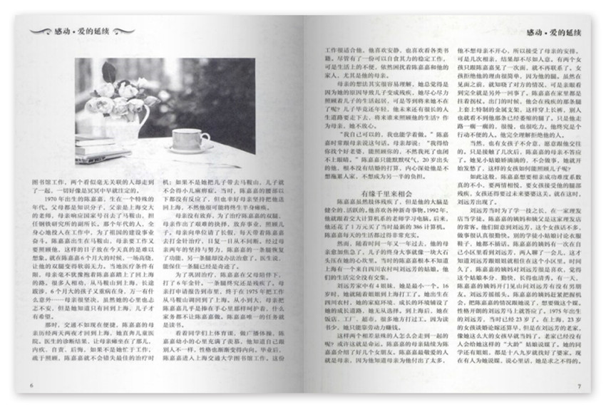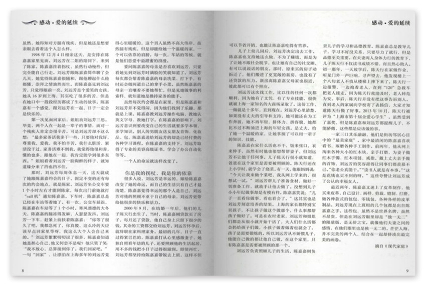 你是我的拐杖,我是你的依靠,很多人說,劉遠芳是幸運的,嫁給陳嘉嘉改變了她的命運。而自己的生活只有自己才清楚,陳嘉嘉覺得幸運的那個人是自己,劉遠芳對他的照顧不亞于自己的母親,劉遠芳更帶給他很多的快樂和活力。2000年9月,在結婚一年后,他們的兒子陳天行出生了。當時,陳嘉嘉剛貸款買了房子,每月還了貸款,他自己身上只留下很少的錢,其余的工資都交給劉遠芳。