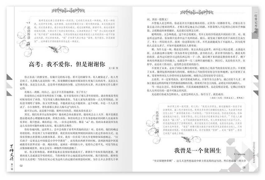 《百師文摘》雜志將與你分享校園時光里珍貴的同學情、師生情;激勵為明天奮斗的激情,揭示心靈中那一點點羞澀的秘密,在青春的日子里,總有一些文字足夠溫馨難忘,像醇酒的濃香,在血液里洶涌而過,讓你沉醉于書香之中 。