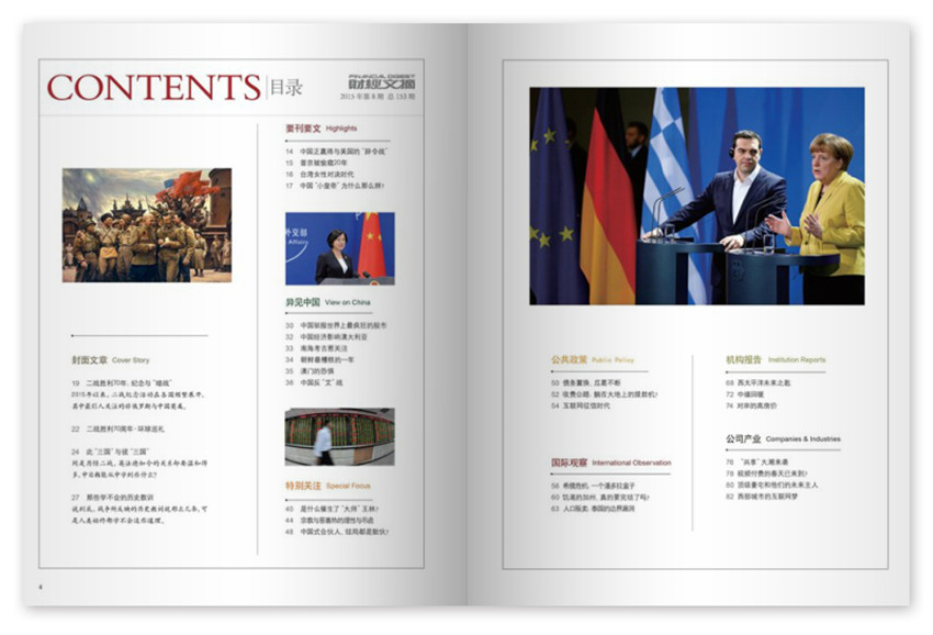 《財(cái)經(jīng)文摘》雜志編譯采擷全球精華的財(cái)經(jīng)文章,所選文章均來(lái)自于海外知名大刊,作者,觀點(diǎn)具有影響力。反映國(guó)際社會(huì)對(duì)中國(guó)政治和經(jīng)濟(jì)狀況的整體評(píng)價(jià)。以獨(dú)特的角度重新剖析熱點(diǎn)話題,言論尺度大,敢于發(fā)出不同于其他媒體的聲音;綜合各家之言,向您展示同一問(wèn)題的不同角度。從而傳遞給讀者的財(cái)經(jīng)信息,贏得了眾多企業(yè)中高層管理者、決策者、學(xué)者等高端社會(huì)群體的青睞。