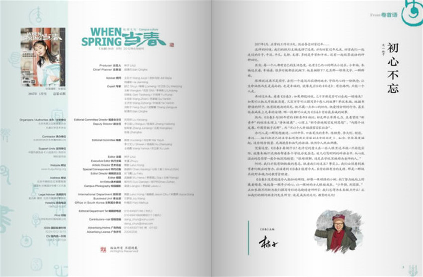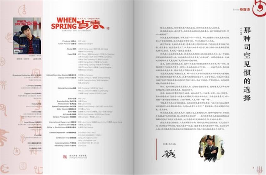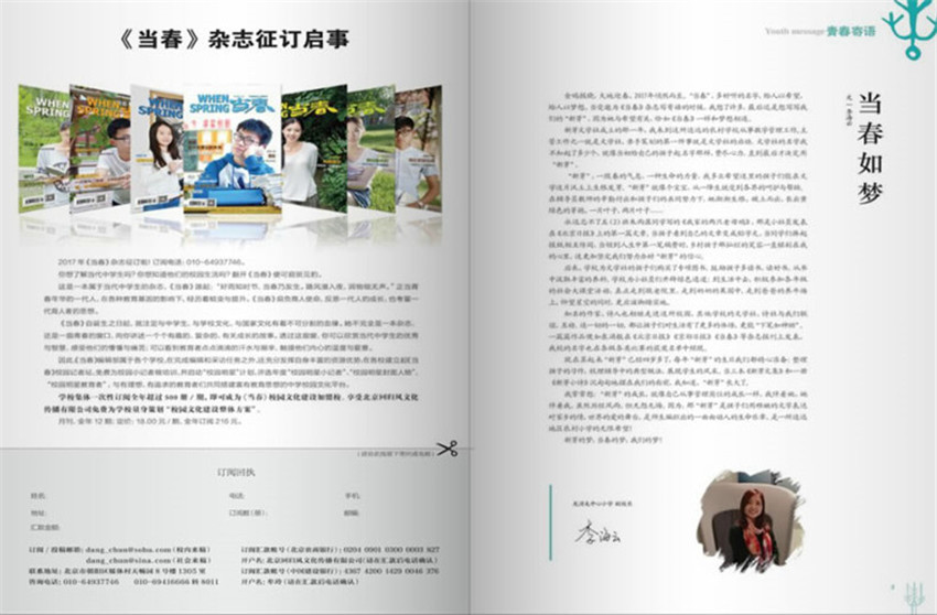 《當春》雜志是全國面對我國中學(xué)及中學(xué)生、有國家正規(guī)刊號且充分展現(xiàn)中學(xué)校園文化生活的月刊,是由北京順義區(qū)教委與北京回歸風文化傳播有限公司聯(lián)合出品,由北京回歸風期刊運營部承擔策劃、編輯、排版、裝幀設(shè)計、宣傳發(fā)行