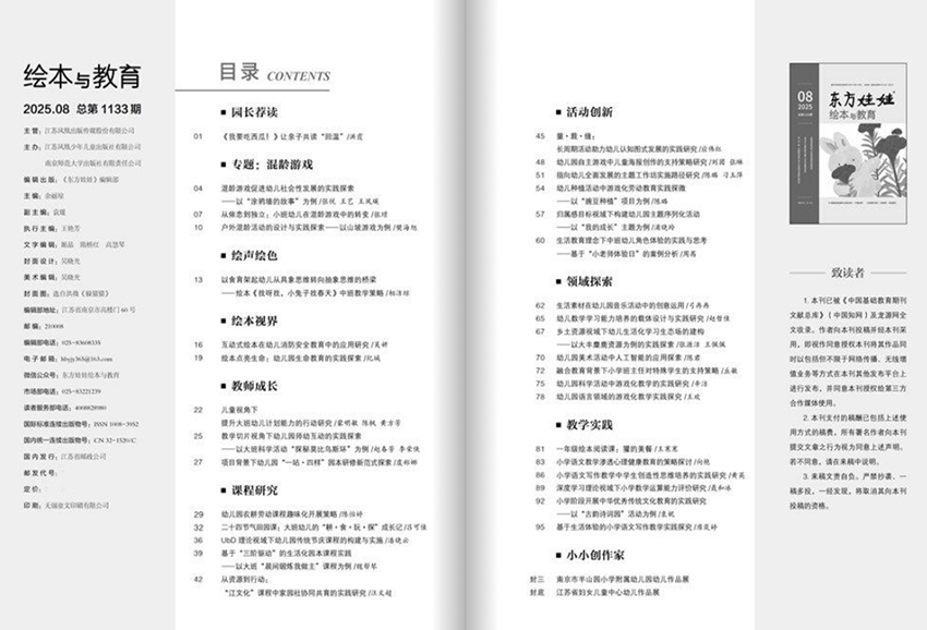 《東方娃娃繪本與教育》雜志是一本專注于繪本與教育相結(jié)合的專業(yè)期刊,它以繪本為載體,將教育理念和方法巧妙地融入其中,為家長(zhǎng)、教育工作者以及繪本愛好者提供了全方位的專業(yè)指導(dǎo)和建議。雜志內(nèi)容豐富多樣,涵蓋了繪本推薦、繪本創(chuàng)作技巧、兒童心理學(xué)、教育方法論、親子閱讀指導(dǎo)等諸多方面,致力于促進(jìn)兒童的身心健康成長(zhǎng)。