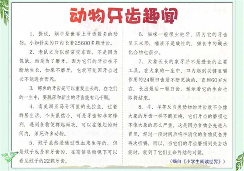 沒有規矩,不成方圓。1.據說,蝸牛是世界上牙齒超多的動物。小如針尖的口內長著25600多顆牙齒。2.老鼠之所以經常咬東西,不是因為饑餓,而是為了磨牙。因為它們的牙齒在不斷地生長,如果不磨牙,它就可能因牙齒過長不能進食而死。