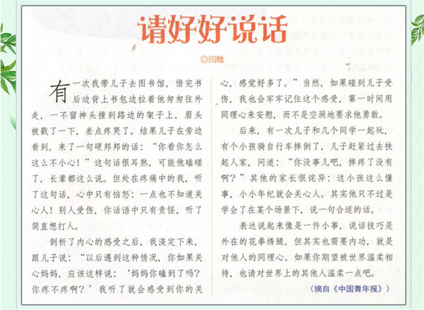 動物牙齒趣聞,有后邊背上書包邊拉著他匆匆往外走,一不留神頭撞到路邊的架子上,眉頭被戳了一下,差點疼哭了。結果兒子在旁邊看到,來了一句硬邦邦的話:“你看你怎 么這么不小心!”這句話很耳熟,可能他磕碰了,長輩都這么說。但處在疼痛中的我,聽了這句話,心中只有惱怒:一點也不知道關心人!別人受傷,你話語中只有責怪,聽了簡直想打人。