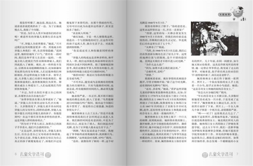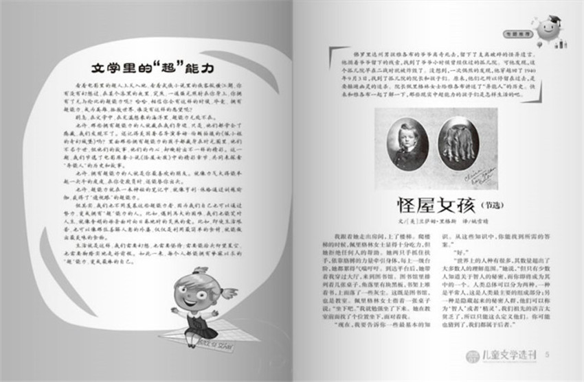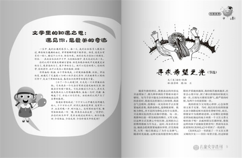 《兒童文學(xué)選刊》文風(fēng)活潑輕松,語(yǔ)言簡(jiǎn)明易懂,屢屢學(xué)習(xí)輔導(dǎo)界領(lǐng)軍作用的重頭文章,給人帶來(lái)了深刻的影響。專(zhuān)題推薦,每期都有由一個(gè)專(zhuān)題而展開(kāi)的系列文章推薦,網(wǎng)羅國(guó)內(nèi)外文章,引導(dǎo)孩子拓寬閱讀面,培養(yǎng)閱讀興趣。分為寫(xiě)實(shí)地帶、幻想空間等4個(gè)小欄目文學(xué)體裁多樣,深受小讀者與家長(zhǎng)的喜愛(ài)是學(xué)生打好寫(xiě)作基礎(chǔ)的學(xué)習(xí)和練習(xí)平臺(tái)。