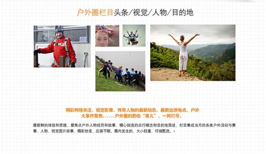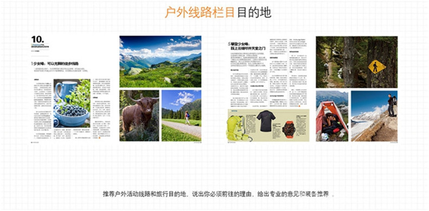 從多方位角度以專業態度結合時尚視角,將戶外運動與潮流消費結合,讓戶外成為城市精英讀者生活和消費方式的一部分;日記:資深戶外人的心路歷程和感知感言,分享他們的體驗,感動所有,目的地:推薦戶外活動線路和旅行目的地,說出你必須前往的理由,給出專業的意見和裝備推薦。