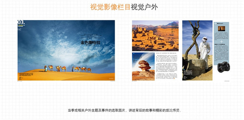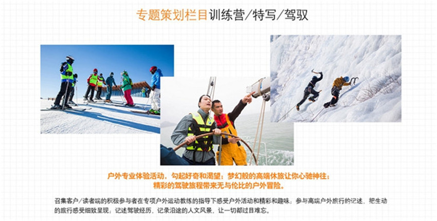 策劃欄目:戶外專業體驗活動,勾起好奇和渴望,夢幻般的高端休旅讓你心馳神往,精彩的駕駛綠城帶來無與倫比的戶外冒險。視覺:當月或相關戶外主題及事件的選取圖片,講述背后的故事和精彩的旅途感受,大玩家:戶外圈內眾所周知的專業戶外人的傳奇故事,發燒友:收集業余時尚玩家的奇聞糗事,看熱鬧,更看熱情。