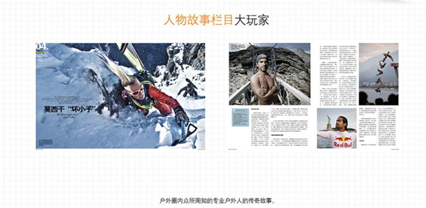 雜志以獨特的“玩家”視角和“興趣為先”的原則,把戶外“圈”中的一切,過濾掉那些復雜的技術點和繞口的專業術語,以時尚、簡單和直白的方式呈現給讀者新鮮的段子,新奇的玩法和炫酷的裝備,讓一個在普通不過的讀者,瞬間也能變成一個“戶外人”。