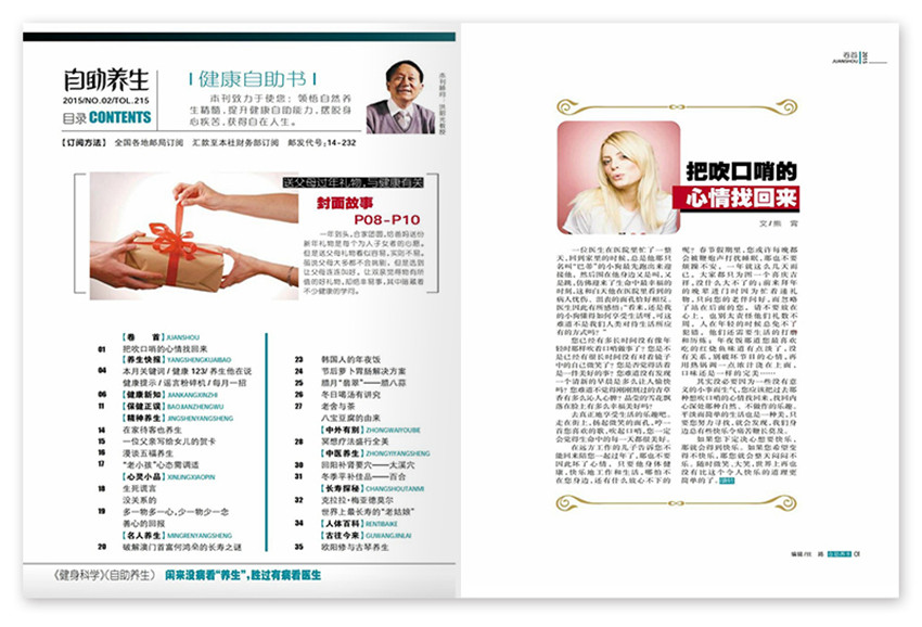 以40-60歲的中老年人為主要讀者群體,定位于有一定經濟條件同時關注養生、有精力有時間有能力的中老年人,除了傳達“以養防病、以養祛病”的理念外,還會是一本關注中老年人及家庭成員身心健康的養生期刊。