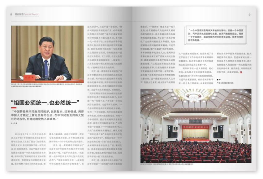 祖國必須統(tǒng)一,也必然統(tǒng)一。“中國夢是兩岸同胞共同的夢,民族復興、國家強盛,兩岸中國人才能過上富足美好的生活。在中華民族走向偉大復興的進程中,臺灣同胞定然不會缺席。”2019年1月2日,中共中央總書記在《告臺灣同胞書》發(fā)表40周年紀念會上發(fā)表了題為《為實現(xiàn)民族偉大復興推進祖國和平統(tǒng)一而共同奮斗》的重要講話。