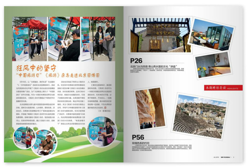《旅游》文風活潑輕松,語言簡明易懂,屢屢旅游攝影界領軍作用的重頭文章,給人帶來了深刻的影響。以圖文并茂的方式介紹國內外特色美食和餐飲文化;講述國內外戶外運動,展示及推薦戶外用品。
