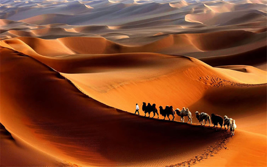 塔克拉瑪干沙漠位于新疆南疆的塔里木盆地中心,是中國較大的沙漠,也是世界第十大沙漠,同時亦是世界第二大流動沙漠。這里,金字塔形的沙丘屹立于平原以上300米。狂風(fēng)能將沙墻吹起,高度可達其3倍。沙漠里沙丘綿延,受風(fēng)的影響,沙丘時常移動。沙漠里亦有少量的植物,其根系異常發(fā)達,超過地上部分的幾十倍乃至上百倍,以便汲取地下的水分,那里的動物有夏眠的現(xiàn)象。