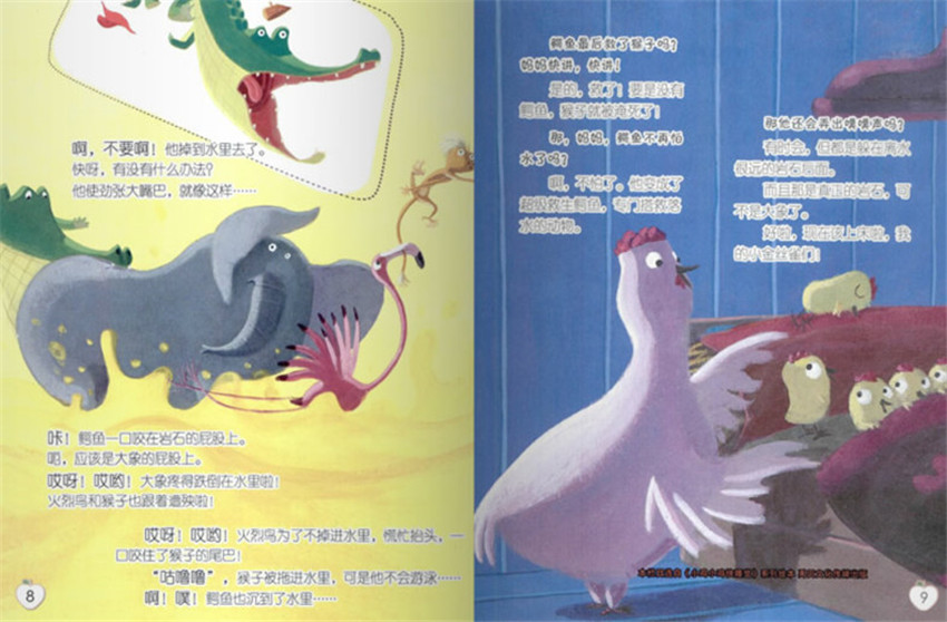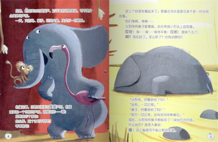 咔!鱷魚一口咬在巖石的屁股上。呃,應(yīng)該是大象的屁股上。哎呀!哎喲!大象疼得跌倒在水里啦!火烈鳥和猴子也跟著遭殃啦!哎呀!哎喲!火烈鳥為了不掉進水里,慌忙抬頭,一口咬住了猴子的尾巴!“咕嚕嚕’,猴子被拖進水里,可是他不會游泳...啊!噗!鱷魚也沉到了水里....