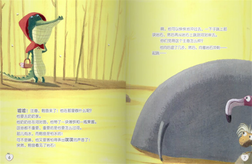 噓噓!注意,鱷魚來了!他在那里做什么呢?他要去奶奶家,他奶奶住在河對面,他帶了一塊薄餅和一瓶果醬。這些都不重要,重要的是他要怎么過河。那兒有水,而鱷魚是怕水的!可不是嘛,他又要害怕得弄出噗噗的聲音了!突然,鱷魚看見了巖石!