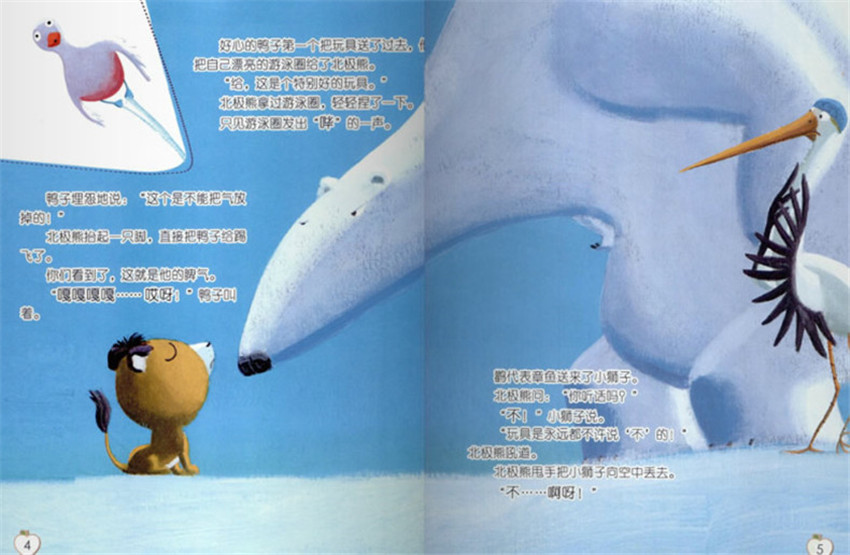 好心的鴨子及時一個把玩具送了過去,把自己漂亮的游泳圈給了北極熊,“給,這是個特別好的玩具,北極熊拿過游泳圈,輕輕捏了一下。只見游泳圈發(fā)出“嗶”的聲。鴨子埋怨地說:“這個是不能把氣放掉的,北極熊抬起一只腳,直接把鴨子給踢飛了,你們看到了。這就是他的脾氣。“嘎嘎嘎嘎..哎呀1”鴨子叫著。