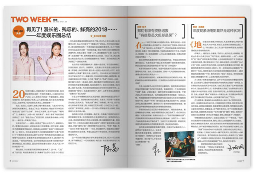 《南都娛樂周刊》文風活潑輕松,語言簡明易懂,屢屢時尚娛樂界領軍作用的重頭文章,給人帶來了深刻的影響。