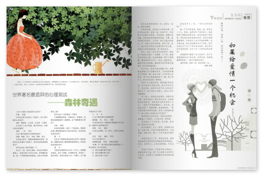 一本貼心的全新兩性期刊,在廣大讀者心目中有著不可替代的位置,時尚、新潮、精美、典雅,鮮明的個性和不俗的親和力,使一批又一批讀者成為自己的朋友,真的應了原來刊物扉頁的一句話;"你我一次偶然,將會成為永遠"。是女性朋友值得信奈的好朋友,定位為18-40歲的女性讀者,倡導自尊、自愛、自信、自立、自強的新時代女性精神,深受廣大讀者的推崇和喜愛。