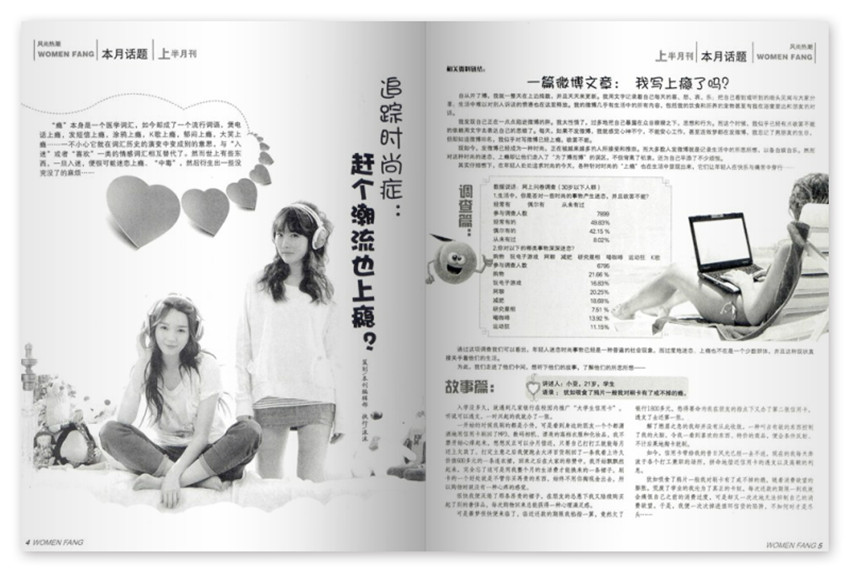 通過處在世紀之交的現代女性心靈路程的揭示和成長經歷的記錄,以及與她們所思所想所憂所喜的溝通和交融,描繪出了當今女性真切的生存狀態、多維的生活方式和追求,以清新活潑的文風,犀利獨到的目光,精致大方的裝幀,水乳交融的文圖吸引著人們,成為都市知識女性白領麗人的精神享受,成為年輕女孩及大學生的良師益友。