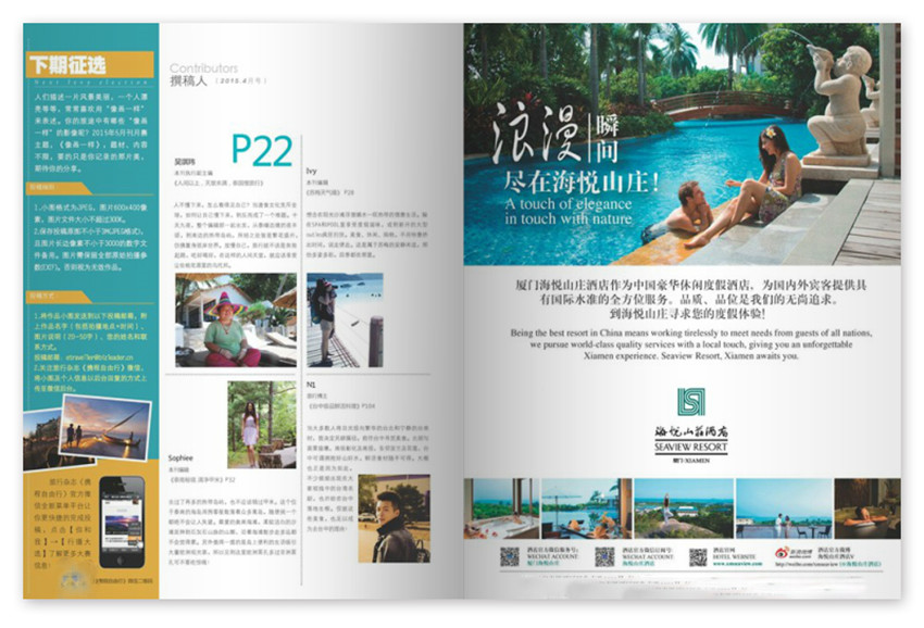 集實(shí)用性、欣賞性、互動(dòng)性于一體,定位于中、高級(jí)商務(wù)人士的高端旅游雜志,覆蓋面之廣,報(bào)道之深,與相關(guān)旅游局合作之密切,在同業(yè)旅游雜志中首屈一指。