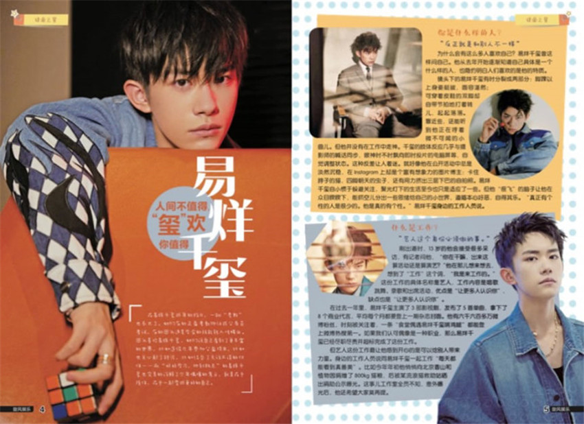 易烊千璽,2000年11月28日生于湖南懷化,中國內地男歌手、舞者、演員,TFBOYS成員,就讀于中央戲劇學院。2005年,首登電視熒屏,開始參演各類綜藝節目。2009年,加入“飛炫少年”組合,兩年后退出。2013年6月,獲邀加入TF家族;8月,以TFBOYS形式出道,2015年10月,為《小王子》男主角配音,該片刷新法國動畫電影在華票房紀錄。11月,表演自編舞蹈《IFYOU》和《RHYTHMTA》,創下愛奇藝生日會直播在線用戶數據高紀錄。