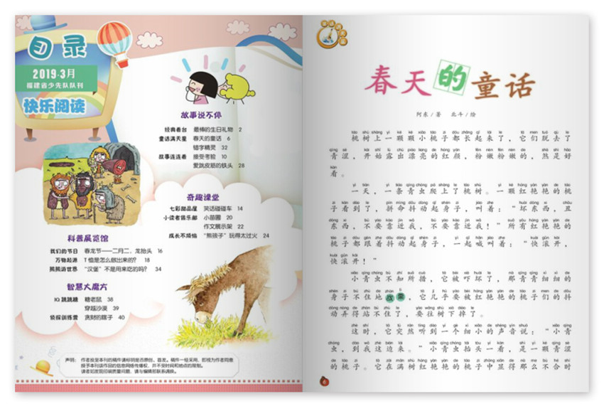 《小火炬》趣味豐富,多彩呈現閱讀的快樂享受除了閱讀和知識的板塊,雜志還有游戲互動和奇妙的科普展覽板塊,內容豐富多樣,讓孩子在閱讀之余可以開動腦筋、做做手工,而且雜志文字簡練,配有精美的畫師插圖,還有幽默的漫畫形式,用多種方式讓孩子享受知識的奇妙、文字的味道和插畫的美好。