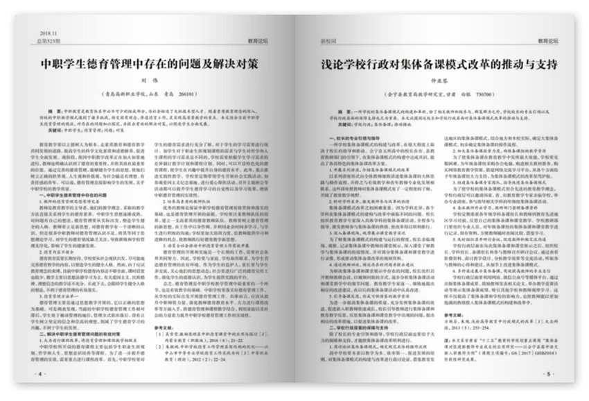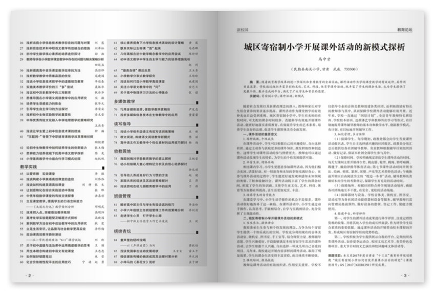 《新校園》文風活潑輕松,語言簡明易懂,屢屢學習輔導界領軍作用的重頭文章,給人帶來了深刻的影響。《新校園》主要欄目有科研教學、職教發展、課程創新、教研視窗、探索者論壇、教法與學法、藝術時空、史地長廊、讀寫先鋒、百家講壇、語文建設、外語角、創新學習、教學相長、應試研究、數理化導學、班主任之友、教育技術學、德育隨筆、圖書與檔案、幼教大觀等。