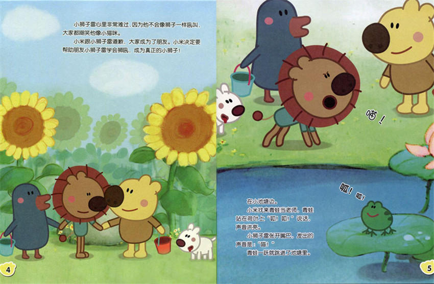 小獅子雷心里非常難過(guò)因?yàn)樗粫?huì)像獅子- -樣吼叫,大家都嘲笑他像小貓咪。小米跟小獅子雷道歉,大家成為了朋友。小米決定要幫助朋友小獅子雷學(xué)會(huì)獅吼,成為真正的小獅子!在小池塘邊,小來(lái)找來(lái)青蛙當(dāng)老師,青蛙站在荷葉上呱呱的說(shuō)話,聲音洪亮。小獅子雷張開(kāi)嘴巴。發(fā)出的聲音是:喵,青蛙一躍就跳進(jìn)場(chǎng)池塘里。