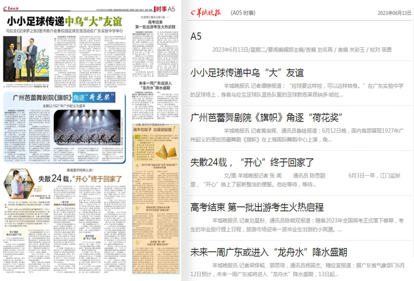 《羊城晚報》是中國廣州市的一份大型綜合性晚報,主要關注廣州市及廣東省的新聞資訊和文化娛樂等領域的報道。該報注重新聞的客觀真實,報道涵蓋整個廣州市及廣東省的社會政治、經濟發展、文藝、體育等各個領域。除了政治、經濟等重要信息報道外,該報還注重深度新聞報道,注重反映社會熱點、傳遞專業信息、解讀時事評論,并具有較高的新聞報道及輿論影響力。
