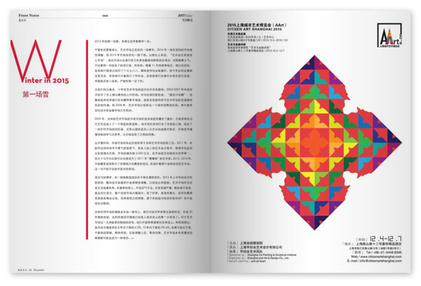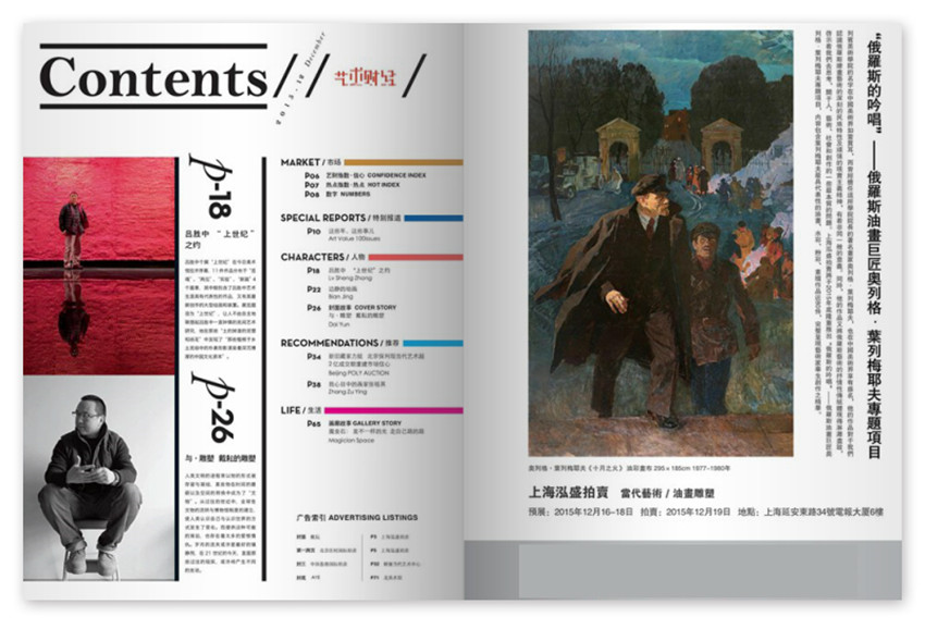 一本順應藝術市場需求,從全新角度打造的藝術市場媒體,雜志擁有卓爾不群的品質、優雅的閱讀感受,和國內強的藝術市場分析實力,通過各大拍賣公司、酒店、機場、書店等渠道,發行量迅速攀升,是國內及時本為高端階層服務的藝術類專業雜志,堅持較高編輯標準,出品人于天宏涉足當代藝術十幾年,先后任國內數家知名傳媒公司高管,積累了豐富的傳媒經驗和深厚的藝術人脈。