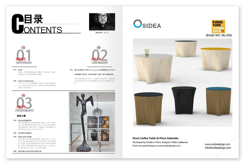 傳播不同文化和地域的設計新思潮,視角獨特,版面時尚,宗旨:傳播中國家具文化、引入先進設計理念、倡導原創設計、挖掘設計師、提升企業品牌形象。欄目:新品前沿、展會之旅、主題季風、專欄、設計力量、學院作品等。