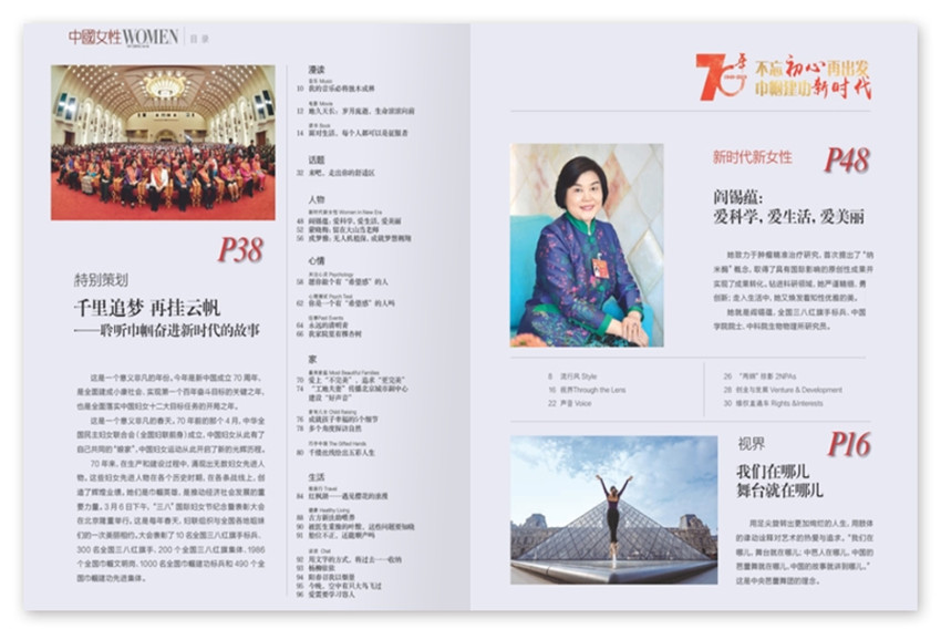 《中國女性》文風活潑輕松,語言簡明易懂,屢屢家庭生活界領軍作用的重頭文章,給人帶來了深刻的影響。堅持正確的輿論導向,引領女性的消費品位和審美情趣,創造和傳播社會主義先進文化,彰顯文化的力量,促進人的全面發展,我們一直在探索與創新中前進,期待與您一路同行。