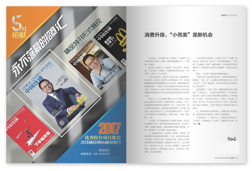 雜志社編輯出版的全國惟一一本面向連鎖創業創富精英的高端雜志,打造連鎖行業及相關聯企業精英人士的泛財經類行業標桿讀本,主要欄目:封面報道、行業資訊、數字、行業、政策、人事、天下、商業評論、商業領袖、創業模式、連鎖視野、資本視點、商道經緯、管理研究等。