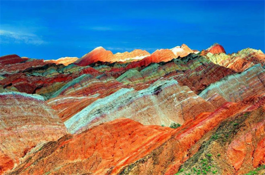 張掖丹霞地貌群,俗稱張掖丹霞,由七彩丹霞和冰溝丹霞組成。如用文字來表達,僅有兩個字震撼。其氣勢之磅礴、場面之壯觀、造型之奇特、色彩之斑斕,大自然的鬼斧神工,令人驚嘆。她不僅具有一般丹霞的奇、險,而且更美的在于色。在方圓10多平方公里的范圍內,隨處可見有紅、黃、橙、綠、白、青灰、灰黑、灰白等多種鮮艷的色彩,把無數溝 、山丘裝點得絢麗多姿。張掖丹霞地貌以她那層理交錯的線條、色彩斑斕的色調、燦爛奪目的壯美畫圖,形一個彩色童話世界。