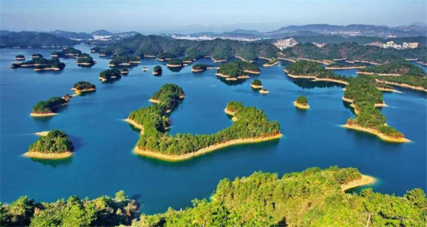 千島湖,即新安江水庫,位于浙江省杭州市淳安縣境內,小部分連接杭州市建德市西北,是為建新安江水電站攔蓄新安江上游而成的人工湖,1955年始建,1960年建成。深處達100余米,平均水深30.44米,在正常水位情況下,面積約580平方千米,蓄水量可達178億立方米,在較高水位時擁有1078座大于0.25平方千米的陸橋島嶼,并以2平方千米以下的小島為主,島嶼面積共409平方千米。