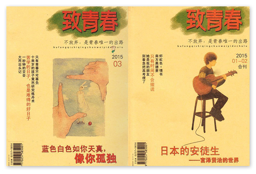 《致青春》是與《讀者》、《格言》、《意林》一起,專門針對正在人生成長關鍵期的中學生制作了一本精品雜志,中學生成長過程中面臨的學習的困惑,日常生活的趣味,考試作文的疑難,面臨親情的矛盾,朦朧愛情的憧憬和淺嘗。